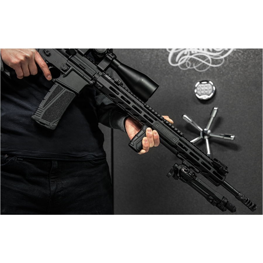Chwyt pionowy to jeden z najczęściej stosowanych dodatków do karabinków, który zwiększa kontrolę nad bronią oraz ułatwia manewrowanie nią. Chwyt wykonano z wytrzymałego polimeru, który dla zwiększenia przyczepności pokryto warstwą gumy o właściwościach antypoślizgowych. Chwyt ma dwustronną konstrukcję, dlatego można go mocować na broni w pozycji odpowiadającej naszym potrzebom.